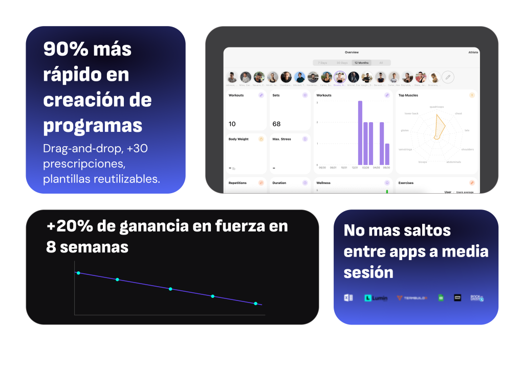 Diseña programas más rápido, haz seguimiento automático del rendimiento y obtén los insights que necesitas para tomar mejores decisiones como coach.