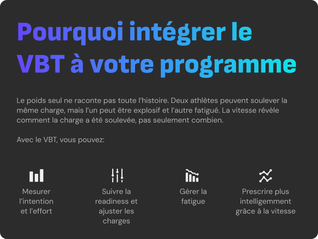 La vitesse est la pièce manquante de l’entraînement de force. Elle révèle ce que la vitesse de la barre vous dit : si vos athlètes sont prêts, fatigués ou à risque de blessure. En suivant la vitesse et la perte de vitesse, vous allez au-delà du simple poids et du nombre de répétitions. Vous pouvez ajuster les charges chaque jour, pousser quand ils sont prêts et arrêter avant la blessure.